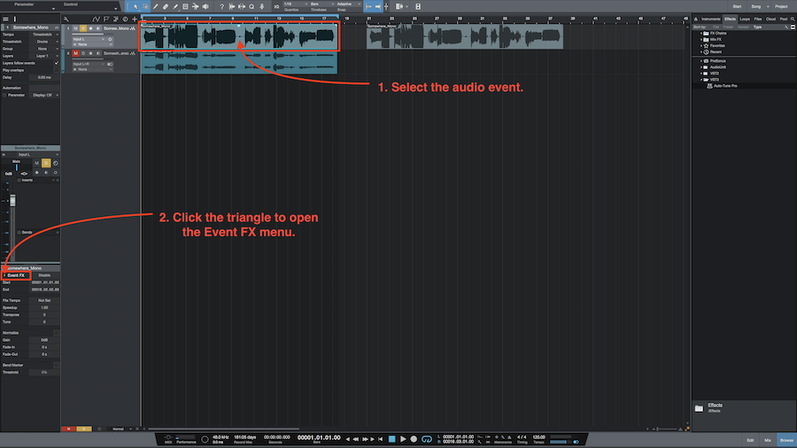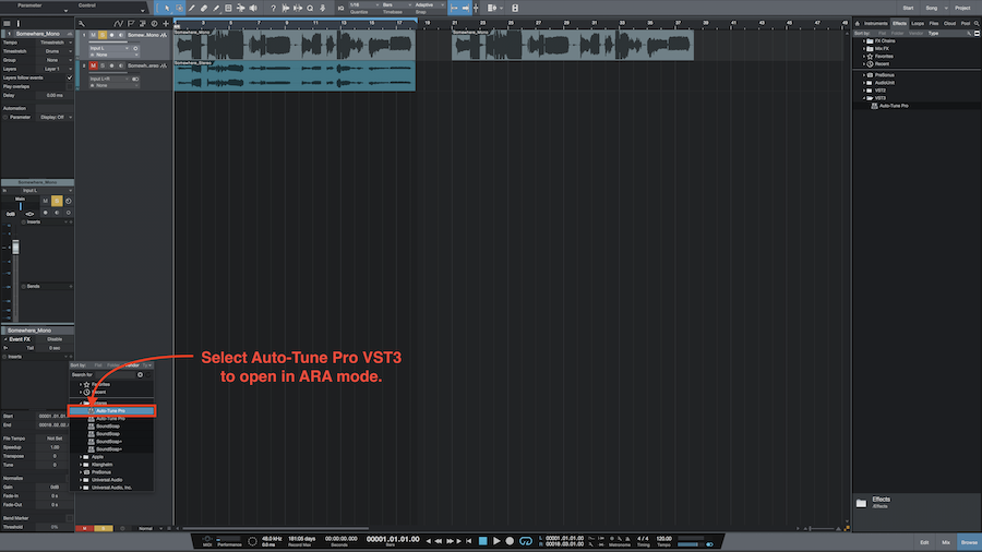 To load an ARA instance of Auto-Tune® Pro, you must add it as an “Event FX” insert on a specific audio event. There are few ways to do so in Studio One:
